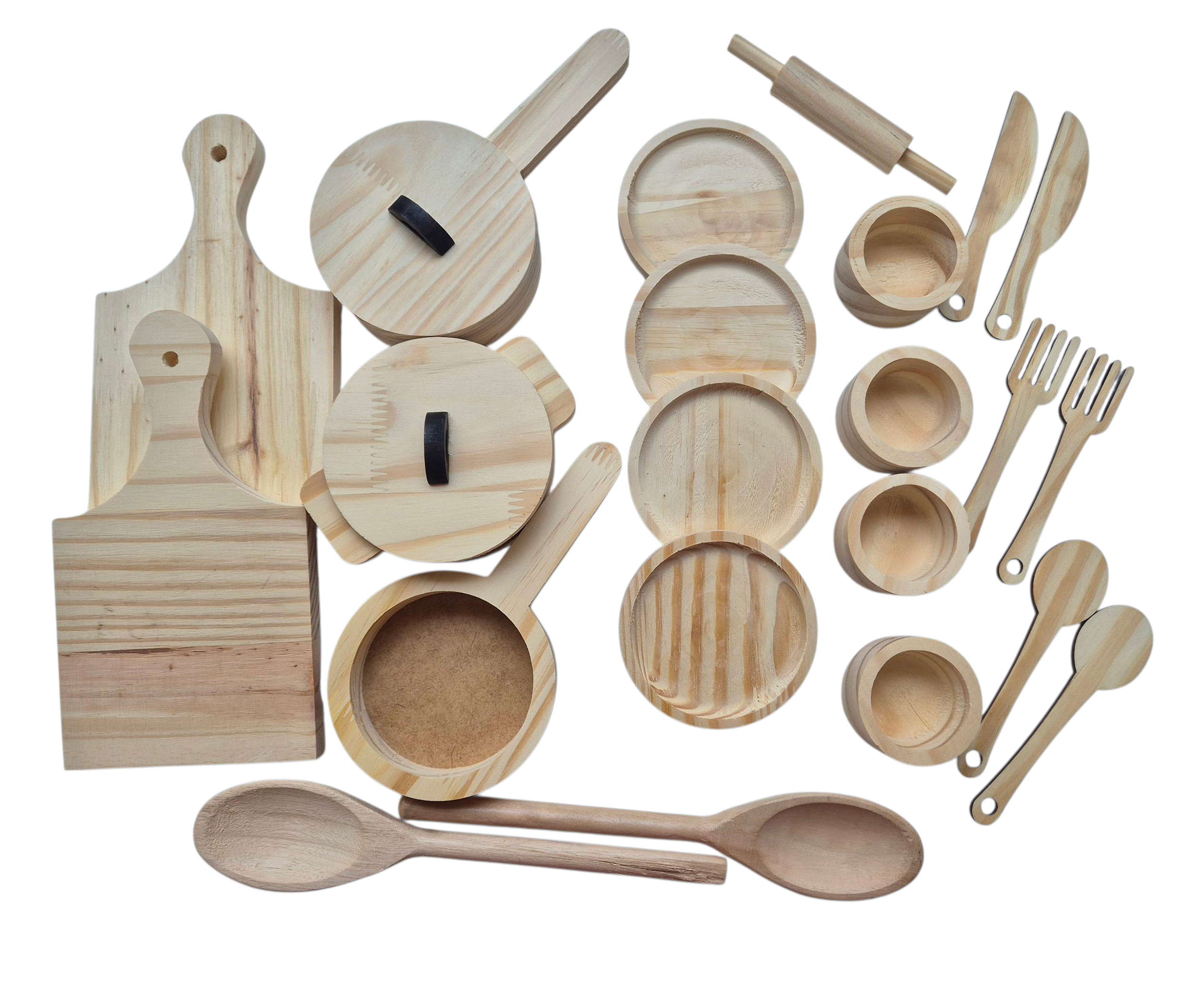 Formado por: 4 pratinhos, 4 potinhos, 2 tábuas, 2 colheres de pau, 3 panelas (1 frigideira sem tampa e 2 panelas com tampa), 1 rolo de macarrão , 2 garfos, 2 facas, 2 colheres