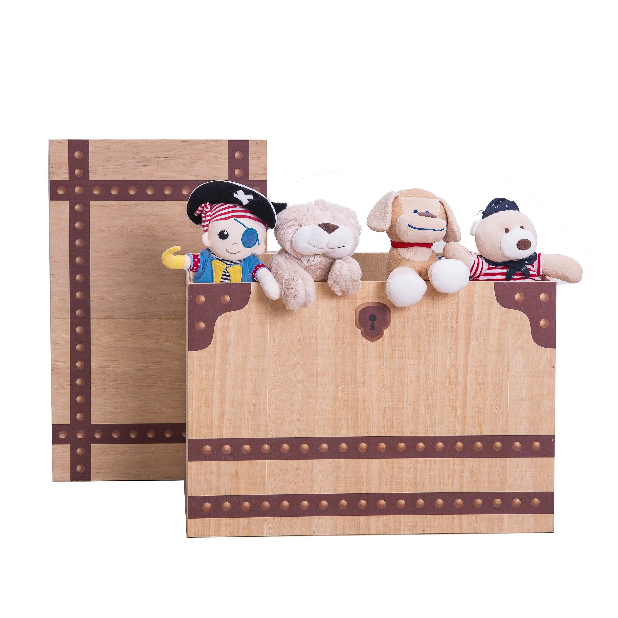 Um baú com design diferenciado, e com impressão na madeira, sob o tema medieval. Muito utilizado para deixar o quarto da criança ou brinquedoteca mais divertida e organizada. Possui um grande espaço interno, podendo acomodar brinquedos, bolas, sapatos, roupas entre outros. Obs: Brinquedos vendidos separadamente.