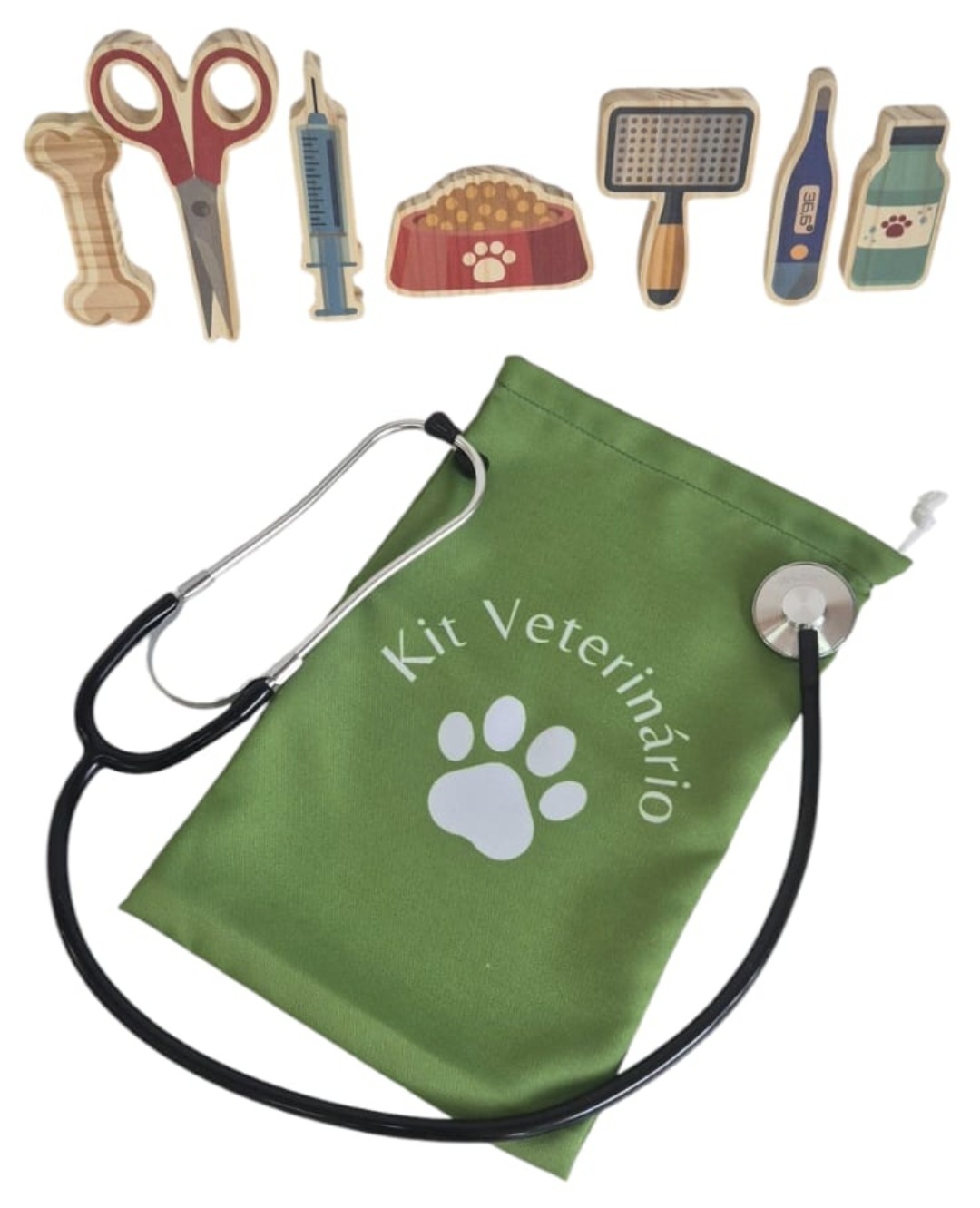 A Fashion Toys acaba de lançar os Kits Profissionais de madeira. Esse kit veterinário é formado por 8 itens, embalados em um saquinho personalizado sob o tema veterinário, para as crianças brincarem de faz de conta imitando o trabalho de um veterinário ou até mesmo num pet shop. Veja foto ilustrativo no pet shop que pode ser adquirido separadamente.